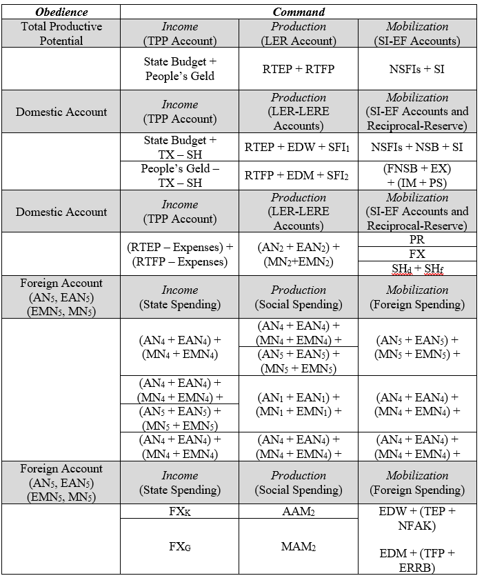 Command-Obedience Account Bookkeeping relies on every aspect of the Total Productive Potential (TPP) equation to determine the amount of Geld that the Central Bank is allowed to print into circulation. Everything points to the values for the State Budget and People’s Geld under “Income,” RTEP and RTFP under “Production,” and the NSFIs and State Investments under “Mobilization.”