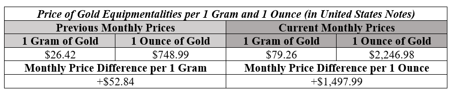 In Illinois, the Federal Kontor of Chicago received stimulating reports from its Office III, immediately relaying them straight to the Securities and Exchange Commission (SEC) in Washington DC. SEC informs the Federal government that “the Price of Gold as an Equipmentality is rising,” despite the impressive economic growth occurring in the United States as of this SMP Compendium entry. Last month, 1 Metric Gram of Gold was worth $26.42 United States Notes (USN). This month, the Price of Gold per 1 Metric Gram has tripled to $79.26 USN, a weekly difference of +$52.84 USN.
