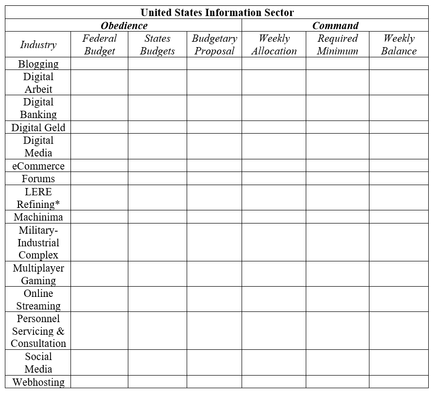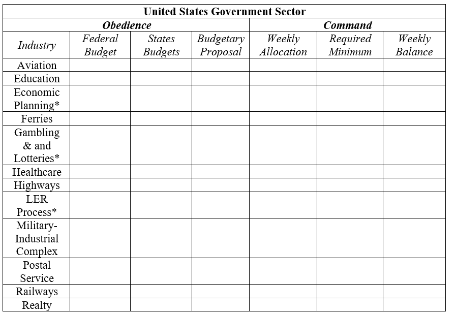 Please note that these following accounting tables as of late are never meant to be complete: I have full confidence in the American people’s ability to always find new ways of contributing Arbeit and generating Geld, in addition to revolutionizing older methods with newer Technology. Besides, the Intent is to demonstrate how Command-Obedience Accounting Bookkeeping would format them when applied by someone in practice. Pay close attention to any Industry that I had marked with an Asterisk (*) because I will be explaining them in further detail.