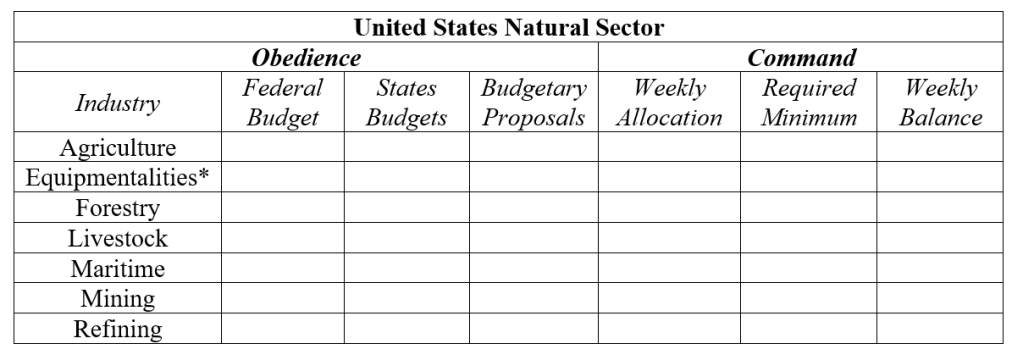 The real distinctions begin when describing the Federalist and States Command Economies. In order to address the distinct characteristics of the United States, I found it prudent to combine the accounts for the Federal and State governments, so that they share the same general table for the Natural, Industrial, Services, Information and Government Sectors. I will then proceed to demonstrate how to format the other tables discussed previously in the Compendium.
