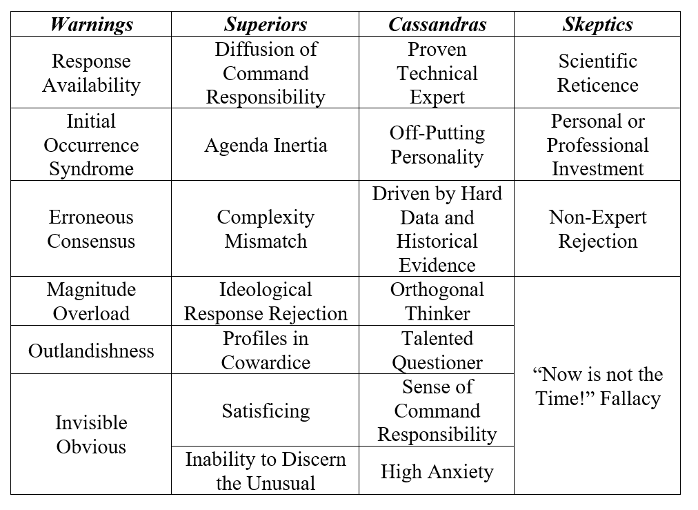 (4) The critics who disparage or reject the warning.There are 4 Components and 24 Characteristics in the Cassandra Coefficient. They read as follows: