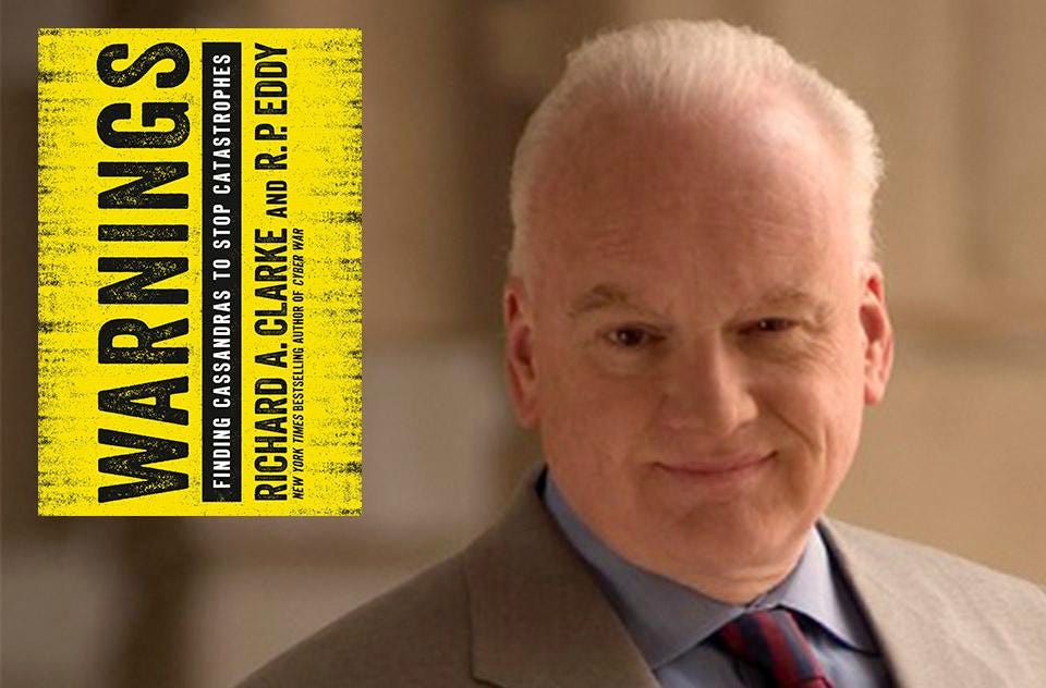 Photograph of Richard Alan Clarke and his 2017 book, Warnings.