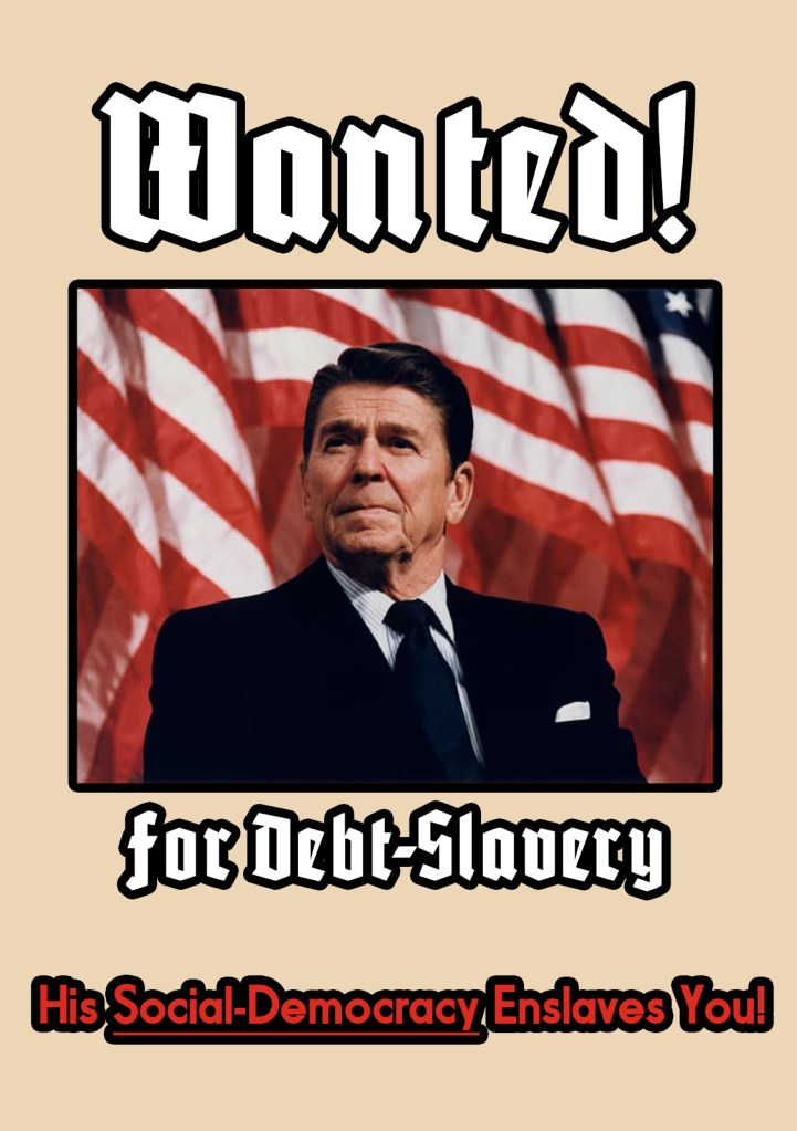 Today, our whole era is dying economically because we have succumbed to fearful hesitation. Enrichment follows investment, not the other way around. Since Hitler, only Ronald Reagan (⇌) has seemed to understand this. As President, he realized that to restore prosperity in the United States meant boldly stimulating the economy with credits and a drastic reduction in taxes, instead of waiting for the country to emerge from economic stagnation on its own.“