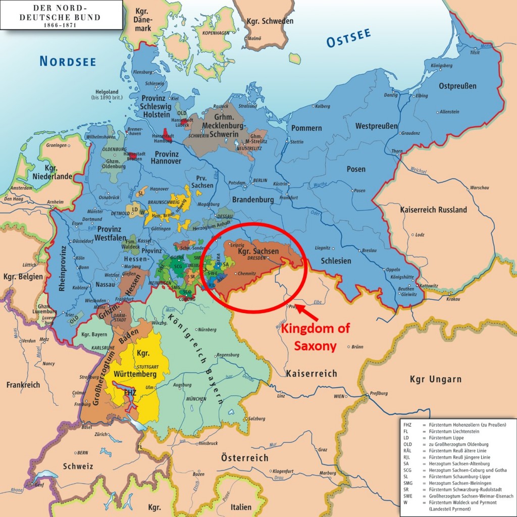 Small mentioned that von Osse wrote Political Testament regarding his experiences with five different State-Electors from the German State of Saxony. This is significant insofar as those State-Electors were once part of the old Electoral College within the German Reich. I should note that von Osse was as much a Jurist as well as a Theologian. Since much of his writing was colored by the circumstances of the Protestant Reformation and the Catholic Counterreformation, I decided to include the most relevant passages from my readings of Small’s The Cameralists. Below are two copies of maps from the 19th century depicting the geographical location of the State of Saxony within the German Reich.