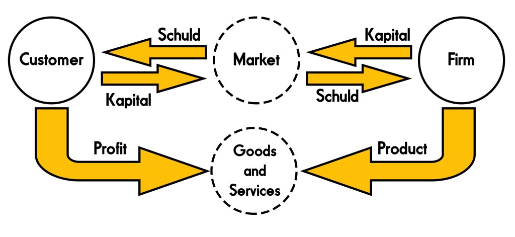 This diagram depicts how Kapital and Schuld are created in a Liberal Capitalist Market/Mixed Economy as part of Production for Profit.