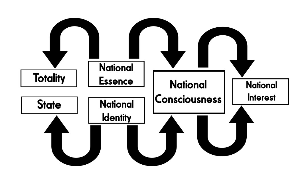 The National Interest is defined by the National Consciousness, which is in turn derived from the National Essence and the National Identity. Both are shaped and molded by the Totality and their State across the centuries. The diagram perfectly describes how Consciousness Theory can traced back to the original trifecta employed by the Work-Standard, the State, Totality and Self.