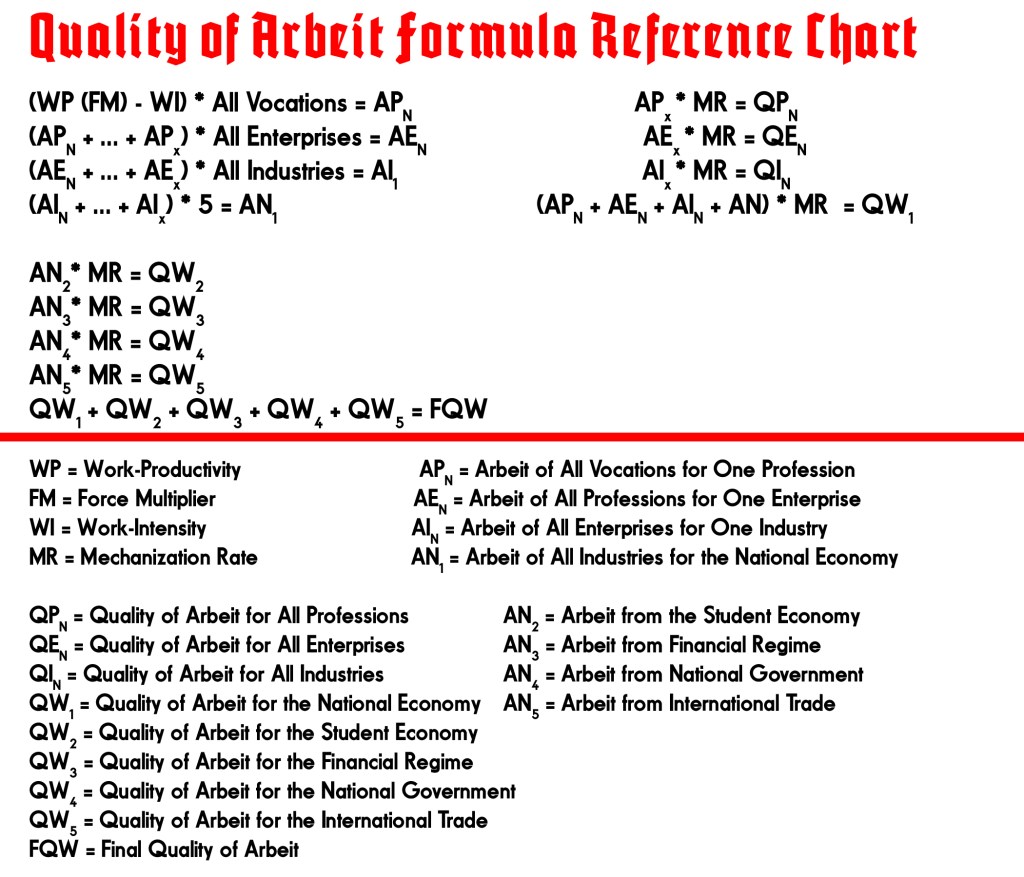 So far, I have been able to compile two Reference Charts outlining the Quality of Arbeit and Quality of Geld Formulas: