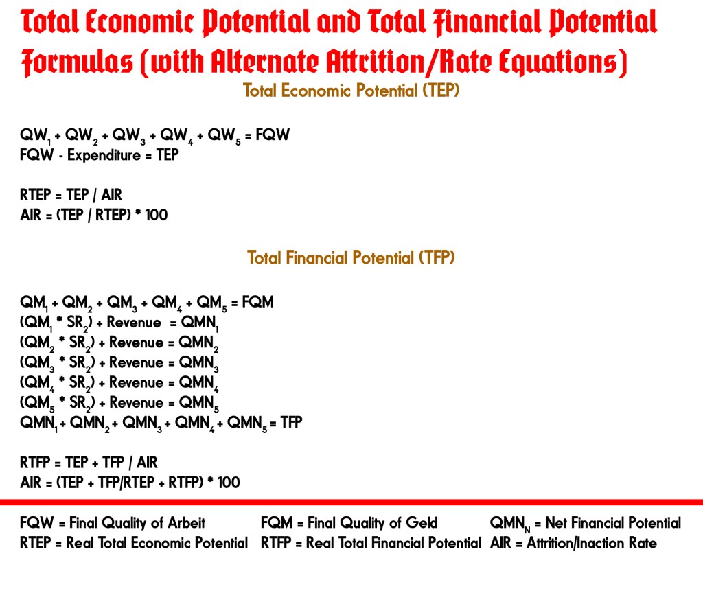 Continuing with my review of the various formulas and equations I provided for the Work-Standard, I decided that some important improvements needed to be made in order to ensure greater accuracy and reliability of the accountant’s handiwork. I felt that the equation for TEP (Total Economic Potential) is more straightforward than what was presented in The Work-Standard (2nd Ed.), whereas the equation for TFP (Total Financial Potential) needed a slight, albeit significant alteration.