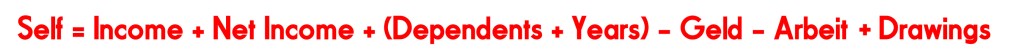 The above equation demonstrates that the sum of the State’s national income is the combined incomes of the Totality and the Self. The Totality and the Self contribute Arbeit to the Life-Energy Reserve, which is controlled by the Council State’s Financial Regime, the Reciprocal-Reserve Banking System, which consists of the Central Bank, the State Council, and the Head of State. The Central Bank oversees the conversions of Arbeit-into-Geld, the resulting Geld added to the State Budget, with a portion of it being distributed to the Totality and Self. In return for contributing Arbeit to the Life-Energy Reserve, the Council State issues them Geld in the form of a weekly Paygrade on a per Household basis, based on years of service and number of dependents.