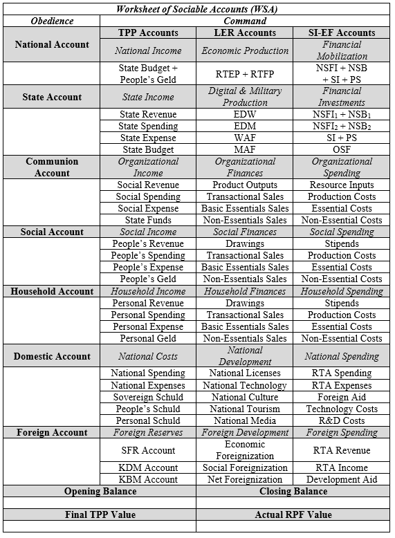 Two years ago, the last Section of The Work-Standard (2nd Ed.) included an accounting table that could serve as the Work-Standard’s equivalent to the System of National Accounts (SNA). That accounting table proved to be too disorganized and ill-suited for serious accounting work as it was an attempt at trying to create one. I even mentioned in The Work-Standard that it was meant to be a mock draft. Today, I just finished a more reliable and improved version called the “Worksheet of Sociable Accounts (WSA).” It will be discussed in relevant Entries of Work-Standard Accounting Practices (1st Ed.). For now, take a look at what I had created: