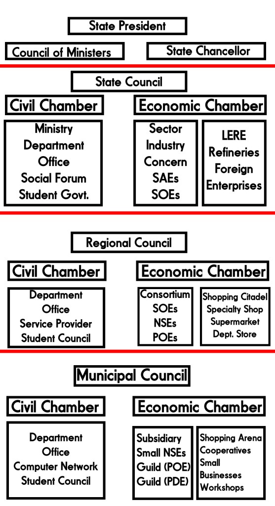 The same process repeats at the Regional Government. “Regional Civil Chambers” and “Regional Economic Chambers” choose their Regional Councilors to elect their Governors and State Delegates. At the State Council of the Central Government, State Delegates of the “General Economic Chambers” and “General Civil Chambers” choose who among them will become the “State Councilors” and “State-Electors,” the latter of whom is responsible for choosing the next Head of State. The Head of State in turn will appoint their Head of Government and State Ministers with the approval of the State Council.