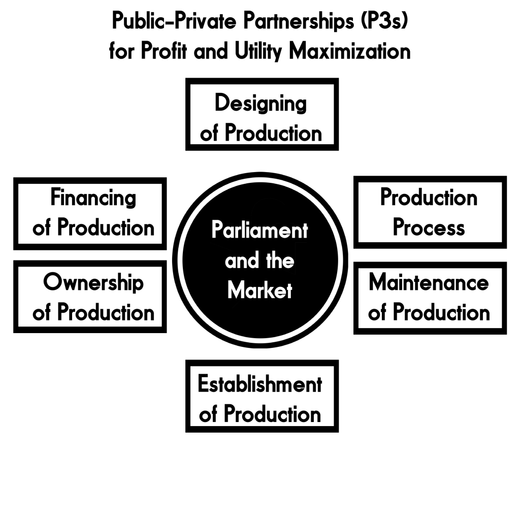 This diagram depicts the six main sources of Kapital and Schuld within the interactions of Parliament and the Market, the Public and Private Sectors, in both Production for Profit and Production for Utility. All six attributes correspond to the basic criteria for most Public-Private Partnerships (P3s), Neoliberalism’s equivalent of the Work-Standard’s National-Socialized Enterprise (NSE).