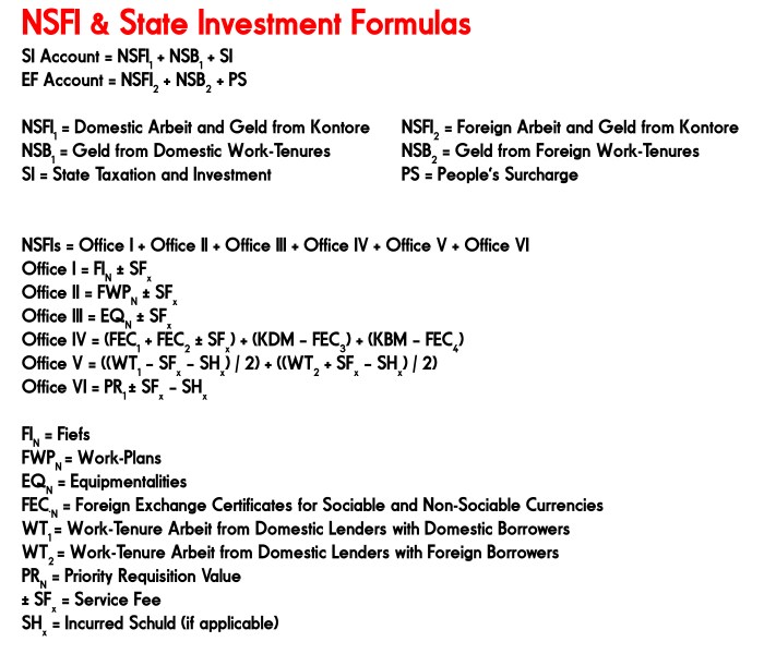 All NSFIs issued by the Kontore are only designed to ensure contributions of Actual Arbeit and Actual Geld to the Life-Energy Reserve. An Investor purchases an NSFI from the Kontor, pays its Service Fee, and proceeds to devote their Life-Energy to the production process of the Enterprise affected by the NSFI. Most NSFIs are designed to enable the Investor to receive Actual Geld in addition to the Paygrade that the Council State wires to their personal bank account at the end of each workweek.