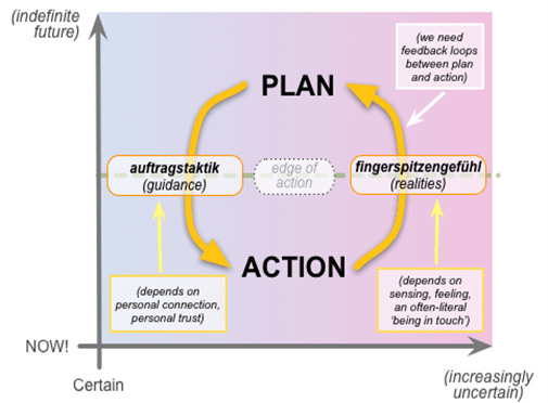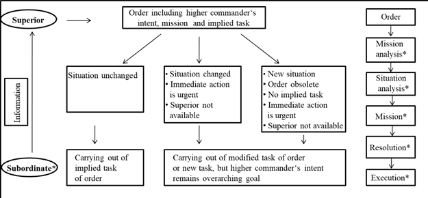 One cannot always expect to be given orders all the time and expect the superiors to tell the subordinates what has to be done. It becomes necessary for the subordinates to eventually demonstrate leadership and take the initiative on their own until a new set of orders arrive from their superiors. Awareness of the “Selbständichkeit” (change of orders) is crucial in knowing when to disregard one’s orders. This is because Auftragstaktik is not an excuse to do as one pleases or commit actions that could violate their orders without understanding the Intent behind why those orders were originally issued. As long as the Intents of Command and Obedience are maintained, any old orders can be safely disregarded by newer ones as conditions change. The following diagrams demonstrate the thought processes behind Auftragstaktik:
