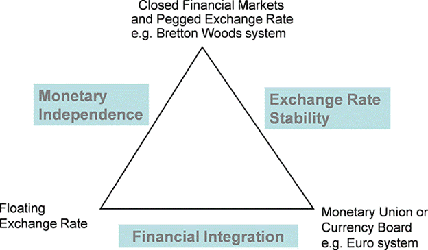 The Impossible Trinity refers to the ongoing dilemma within Exchange Rates where Currencies must balance between Sovereignty, Stability, and Mobility. In its simplest form, the Impossible Trinity insists that a Currency can emphasis two of the three attributes at the cost of sacrificing the advantages of the third attribute.
