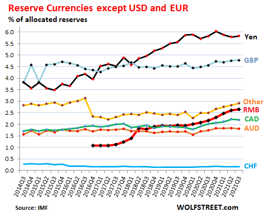 The other potential Currency, the PRC’s Renminbi, is still a very small fraction of the foreign exchange reserves outside Mainland China. There has been a lot of hype about the rise of the Renminbi by Liberal Capitalists. Despite the Renminbi being part of the Basket of Currencies backing the IMF’s Special Drawing Rights (XDRs), the Currency has seen a slow, steady increase. The increase is nowhere as high as some would like to believe, especially when compared to the British Pound Sterling and the Japanese Yen. Those two Currencies, meanwhile, saw small increases in foreign exchange reserves between 2014 and 2021. Even so, the Renminbi, Euro and Yen are nowhere close to breaking the 20% threshold in foreign exchange reserves anytime soon.
