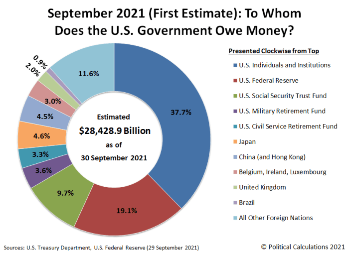 As long as a sizable portion of the Schuld created on Earth in the early 21st century remains denominated in US Dollars, the Jeffersonians will continue to constitute a financial hegemony over the foreign exchange reserves of whole nations. The obvious benefit is the ability to run ever-increasing amounts of Schuld vis-à-vis the US National Debt because the vast majority is being created in the US through the Borrowing and Lending of Kapital for Schuld with Interest. Most of the Schuld in the US National Debt can be traced back to the following sources: