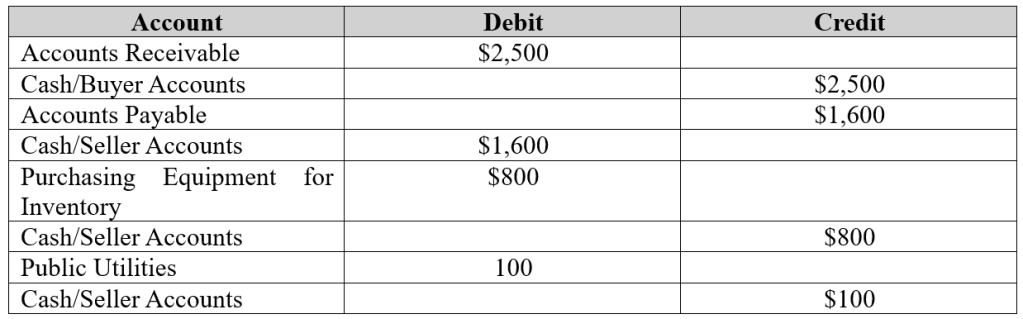 The next table will document two events affecting four separate pairs of accounts associated with an Economic Organization, including two pairs that are reserved for Accounts Receivable/Payable. One pair of accounts describes how $2,500 USD was recorded on Accounts Receivable due to an Economic Organization earning that same amount from its transactional sales. The second pair of accounts is an Accounts Payable of $1,600 USD that an Economic Organization paid as part of its Expenses. The third and fourth pairs outline how the Economic Organization spent $800 USD on acquiring new equipment and $100 on basic utilities (power, water, fuel, et al.) provided by Parliament. Assume that the Economic Organization had an Opening Balance of $0.00 USD and ended with a Closing Balance of $0.00 USD.