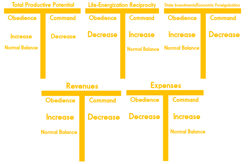 The X-Chart was designed in such a manner that the Obedience Side typically represents an increase to the balance of an account, such as those held by an Enterprise. Values entered on the Command Side denote any decreases to the same account. It will take some time to get used to them, but if it helps, I have assembled the following information for ease of reference: